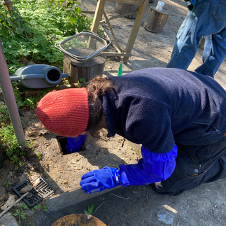 This week Mark was digging the drain to try and discover why it is blocked. It started with a huge pair of blue gloves and resulted in a massive hole. Work is to be continued! We were so pleased when we opened the kiln to take a look at the charcoal from last week's burn. It is looking very promising.