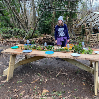 What a fantastic festive celebration we had today. We finally sat down around the magnificent banqueting table and had our Christmas lunch together. The table was dressed with holly, ivy and other foliage gathered from the woods this morning. We brought some to share and this included mulled spiced apple juice, sausage rolls, cup cakes, cookies, mince pies and savoury S'mores. A real feast of festive treats!