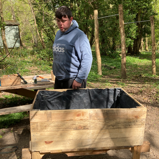 On Wednesday we had a fab day finishing off one planter and making a completely new one too! The supporting diagonals on the legs and liner was added to the almost completed planter and we then dug some soil and biochar and mixed them together and filled the new planter. We tended the plants and fruit trees and bushes growing in fruit corner, as well as tending the seedlings in the poly tunnel. The tadpoles were fed and they are still enjoying the cucumber. Helen is delighted that a window has been added to the poly tunnel and will release some of the heat on sunny days.