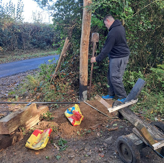 On Wednesday, we completed the big task of replacing the fence post and rehanging the gate. Firstly, the post hole was dug deeper and the final piece of rotten post removed, meanwhile the new post was finished being charred. The post was then placed into the hole and cemented in. Finally, the gate furniture was added and the gate hung. It has been a real team effort.