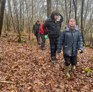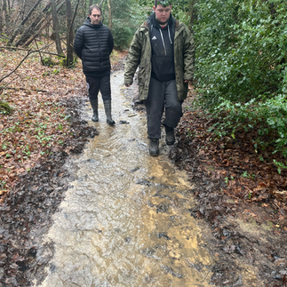 Wow! That really was the wettest morning we've ever experienced at The Heartwood Project. We had such heavy rainfall for the entire morning that it transformed the site completely. We even had to dig trenches to channel the flow of water cascading through our fire area! However, we put up two tarps and were able to give everyone an undercover area to work. Once the rain stopped after lunch we went for a walk with Barley and Twig, Twig climbed her first fallen tree.