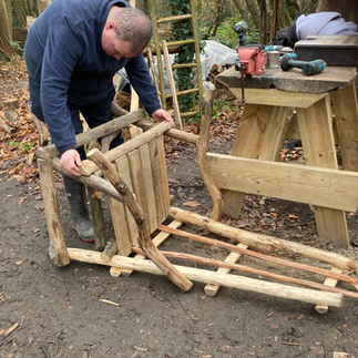 Today was an industrious one. We fixed a broken chair, continued work on a bird table and burnt the end of the final support post for the kitchen. Construction has sarted on building the frame for the worktop.